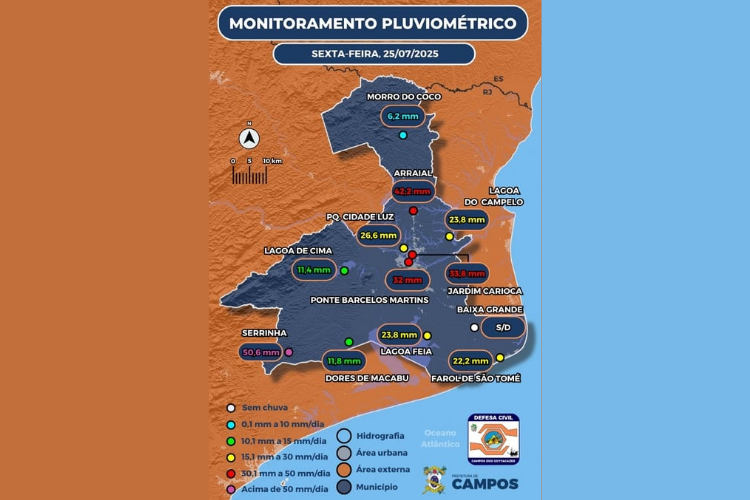 Já em Morro do Coco (6,2 mm), Dores de Macabu (11,8 mm) e Lagoa de Cima (11,4 mm), o volume de chuva foi menor. Em Baixa Grande, na Baixada Campista, não houve registro de precipitação até o momento.