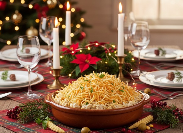 4 – Transfira a mistura para uma travessa e cubra com batata palha.